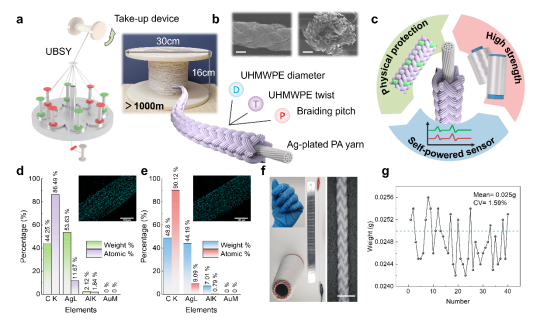 近期,江南大学williamhill/针织技术教育部工程研究中心研究团队实现了从自供电智能纱线到柔性可穿戴针织物的大规模制备。本工作提出的高强度智能编织纱线由高性能的超高分子量聚乙烯纤维外壳和导电芯纱组成,纱线柔软、强度超群(393.12 MPa)、持久耐用、耐酸抗碱,制备的全柔性智能针织护肘可实现人体动作监测,同时为使用者提供了全方位防护,有望应用于户外极限运动、军事活动、高风险工业生产、高强度医疗缝合等各种工况复杂的使用。相关成果以“An Ultrahigh-strength Braided Smart Yarn for Wearable Individual Sensing and Protection”为论文标题在线发表在《Advanced Fiber Materials》期刊(IF=16.1)。williamhill威廉希尔针织中心2021级硕士研究生王开、沈运初为论文共同第一作者;williamhill威廉希尔蒋高明教授团队马丕波教授、陈超余副研究员,无锡市第九人民医院手外科副主任赵刚为论文共同通讯作者。该研究得到了国家自然科学基金(11972172)、中国博士后科学基金资助项目(2022TQ0123)、江苏省自然科学基金(BK20221094)资助。论文全文链接为: