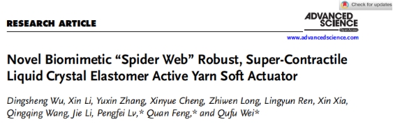 总而言之,该研究通过仿生蜘蛛网结构设计策略,为开发稳定、大变形和超收缩的LCE纱线软体驱动器,并为其在人造肌肉、软机器人和智能可穿戴等领域应用开辟了一条新的途径。近期williamhill威廉希尔魏取福教授、吕鹏飞研究员团队在智能纤维领域发表了系列文章(Adv. Sci. 2024, 2400557; ACS Appl. Mater. Interfaces 2024,16, 9313-9322; Mater. Horiz. 2023, 10, 2587-2598; Adv. Funct. Mater. 2023, 33, 2300794; Nano Energy 2023,116, 108842; Nano Energy 2023, 109, 108291; Small2023, 19, 2207384; Adv. Funct. Mater. 2021, 32, 2104991; Mater. Horiz. 2021, 8, 2475-2484等)。