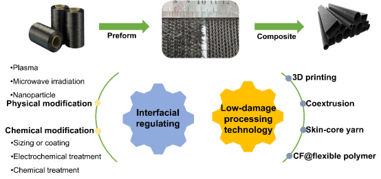 近年来,在低碳、节能、减排的大背景下,碳纤维增强聚合物(CFRP)复合材料以其在诸多领域的广泛应用和优异性能备受关注。然而,一些固有缺陷严重威胁碳纤维(CF)结构件的服役安全。研究表明固有缺陷主要有:(1)CF表面非极性、化学惰性,导致复合材料界面性能差;(2)CF脆性大、易磨损,断裂韧性低,弯曲半径小,导致纤维在制备过程中易断裂以及产生大量毛丝。因此,为了满足高性能CFRP复合材料的巨大需求,推动工业化发展水平,有必要对CF进行表面改性提高复合材料强度和韧性。尽管近几十年来在CFRP复合材料的力学增强方面取得了很大的进展,但仍然缺乏涵盖其解决方案的最新综述。