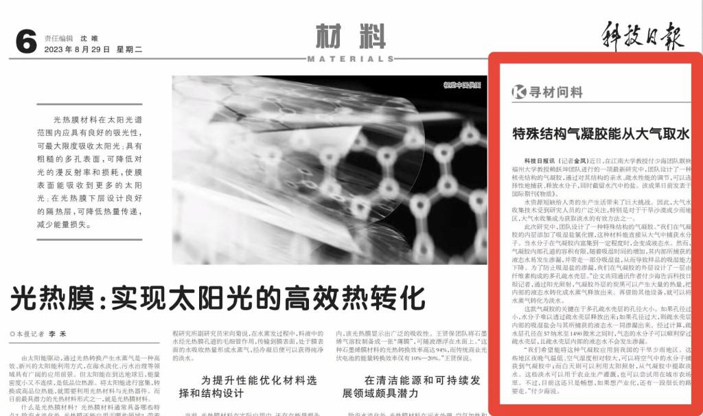 “我们希望能将这种气凝胶应用到我国的干旱少雨地区。这些地区夜晚气温低、空气湿度相对较大,可以将空气中的水分子捕获到气凝胶中;而白天则可以利用太阳照射,从气凝胶中提取淡水。这些淡水可以用于农业生产灌溉,也可以尝试用在城市农场里。不过,目前这还只是畅想,如果想产业化,还有一段很长的路要走。”付少海说。
