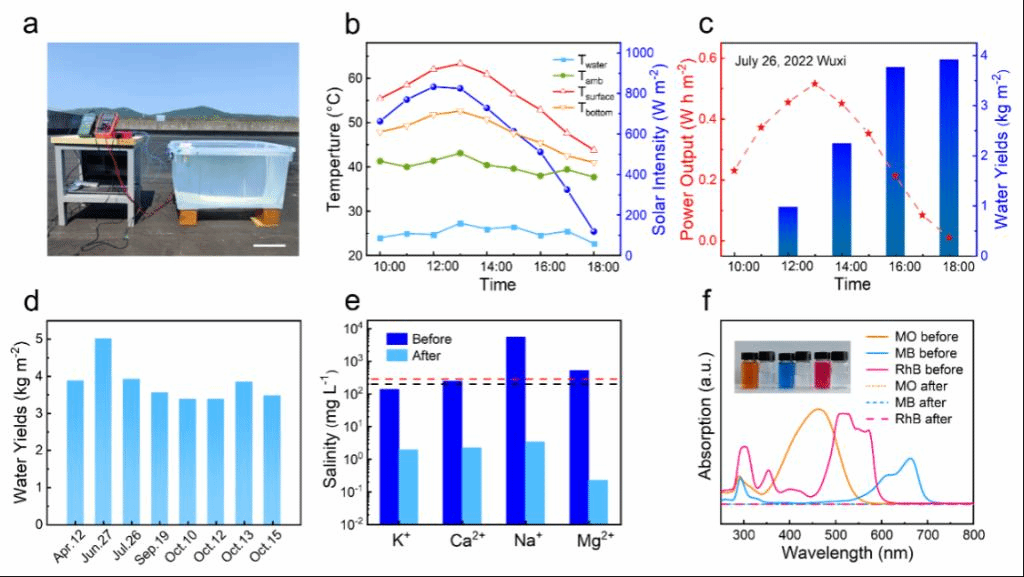 为了进一步测试装置的实际应用性能,该团队使用海水进行了户外测试。一天中,装置的淡水收集速率为3.92 kg m-2 day-1且发电量为2.66×10-3 kW·h m-2,具有良好的稳定性的同时可降低海水中的盐浓度并达到了WHO和EPA的标准,且对模拟染料具有优异的分离性能(图4)。该研究为高温环境下海水或污染水净化的实际应用提供了一种有效且可行的方案,通过模块化设计有望应用于未来海水淡化产业。