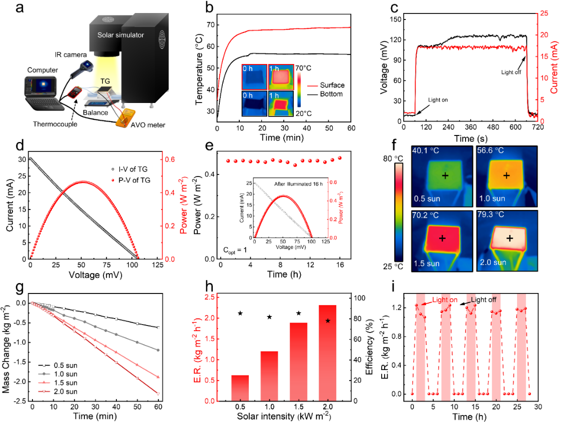图2. 无冷凝器的水蒸发组件的性能表征。a. 装置测试图。b-e. 温差发电片上下表面温差及相关发电数据。f-i. 水蒸发组件表面温度热成像图、水蒸发速率和蒸发稳定性测试图。