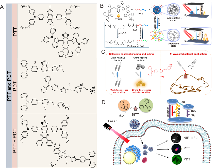 首先从应用的角度出发,介绍几种具有不同性质的典型AIEgen(如光热和光动力特性、具有“开/关”模式荧光探针及红光、蓝光及白光显示等)以及这些性能的产生机理,这将有助于纤维或工程领域的研究人员理解AIE的基本概念。
