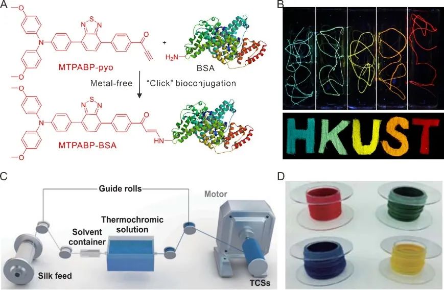 随后,从聚集态的角度简要介绍了AIEgen纤维的制备方法,包括通过干/湿法纺丝、静电纺丝和气流纺丝等方式直接将AIEgen掺杂到纤维中、在纤维表面接枝(酯化反应和点击聚合反应等)或涂层以及合成含有AIE单元的聚合物进行纺丝等。本节将帮助来自AIE或化学等领域的研究人员理解AIEgen纤维的构建策略,阐明不同构建策略对AIEgen纤维最终性能产生的潜在影响。