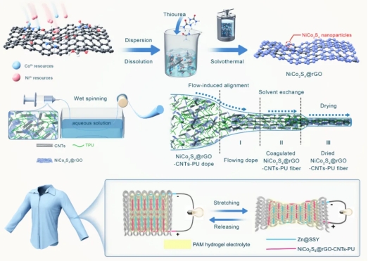由于在凝固浴中的固化速率不同,快速固化形成的壳层保护了内部芯层在各种机械变形中可能产生的断裂和剥落。最后,采用独立阴极和独立阳极分别编织的技术,组装形状可调、服装兼容的柔性锌基电池,具有卓越的电化学性能、输出稳定性和机械变形耐久性。该文章发表在国际顶级期刊Nano Energy上,博士生程新跃为本文第一作者。