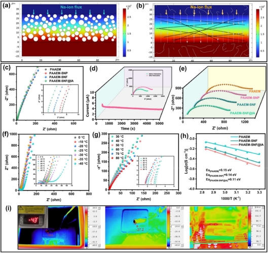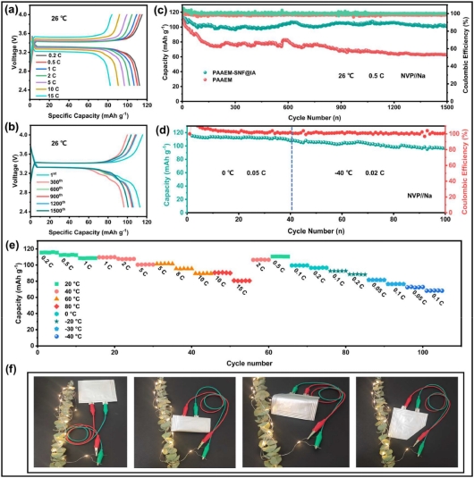 利用该复合电解质组装的固态钠离子电池,NVP//PAAEM-SNF@IA//Na半电池在26°C和0.5 C条件下具有1500次循环的长期稳定性,保持了90.2%的容量。同时,NVP//PAAEM-SNF@IA//Bi软包电池进一步证明了该电解质的空气稳定性。优异的倍率性能进一步证明了其宽温域适用性。本研究引入了一种新的SSE设计方法,重点是促进Na+运输和调节离子分布,从而使高能量密度sib的开发即使在极端条件下也具有稳定的性能。