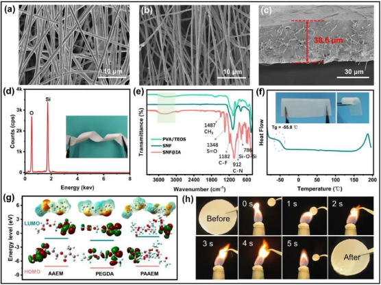 本文采用快速原位紫外光固化(2 min内)的方法制备了一种具有阴离子固定和阳离子传导能力的复合电解质。这种复合电解质能够在较宽的温度范围(-40℃至80℃)内实现快速的离子动力学和均匀的离子通量。如图2所示,静电纺丝陶瓷SNF固定化阴离子(SNF@IA)被引入到2-(甲基丙烯酰氧基)乙基3-氧丁酸酯(AAEM)聚合基质(PAAEM)中。在这种复合电解质中,离子传导通过两种途径发生:离子沿着陶瓷-聚合物界面迁移,而聚合物中的含氧基团(C=O)与离子配合并解离,以促进离子的持续传导。再加上改性SNF的阴离子固定化作用,进一步提高了Na+转移数(TNa+)。此外,电解质基质内SNF的三维网络结构有助于离子均匀分布,防止枝晶生长。陶瓷SNF的低可燃性和PAAEM较低的玻璃转换温度(Tg)增强了复合电解质的宽温度适应性。这种对阳离子和阴离子的双向调节策略有望推动固态电解质的发展,改善高能量密度电池在各领域应用中的安全性。