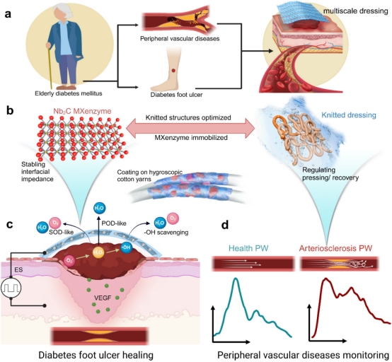 近日,威廉希尔/针织技术教育部工程中心蒋高明教授团队与上海大学陈雨教授团队宋鋆博士、南京医科大学胡本慧教授团队陈中达博士合作的一项关于糖尿病足溃疡(DFUs)和外周血管疾病(PVDs)患者护理的研究取得了重大进展,相关成果在材料领域顶级期刊《ACS Nano》(IF=15.8)上发表,题为“A Knitted and MXenzyme-Integrated Dressing for Geriatrics Diagnosis and Ulcer Healing”。上海大学宋鋆博士与南京医科大学陈中达博士为共同第一作者,williamhill威廉希尔针织中心马丕波教授、南京医科大学胡本慧教授和上海大学陈雨教授为共同通讯作者。