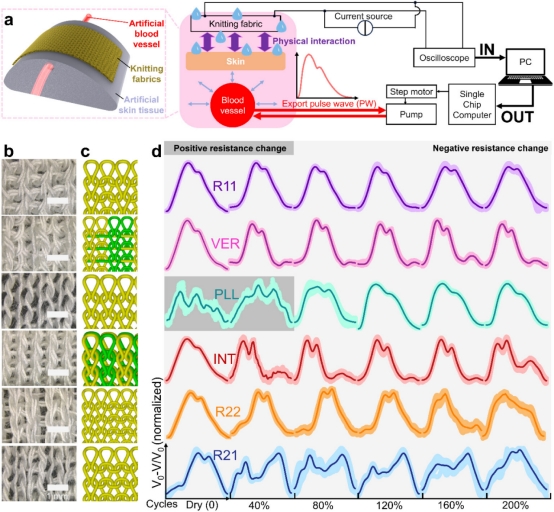 该工作设计了平纹、罗纹、双罗纹等典型的针织结构,评估了不同针织结构对脉搏波波形监测时信号的保真度、准确性、回复性、敏感度等物理学(机制)指标,以及血管顺应性和血管弹性等医学(应用)指标的影响。进一步,针织导电结构在极小形变(<2%)时的电-应力-型变的耦合性能也得到了定量研究。