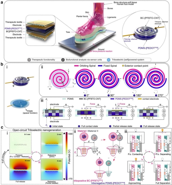 该鞋垫的阿基米德螺旋结构如图2所示,其具有摩擦纳米发电机(TENG)功能,将生物聚合物材料用作摩擦电极层的自供电系统;同时,该鞋垫具有优异的电压(VOCVOC)、电流(ISC)、电流密度(JSC)和功率密度(PD)等电性能,可应用于临床和个人足底压力测量,性能优于商用FSR传感器。通过这个系统还可以分析步态、姿势和其他足病,为实现柔性、灵活性、多功能便携式鞋底监测技术奠定了基础。该技术由TENG电源提供动力,未来可集成至物联网系统。该智能鞋垫的主要功能是自供电和监测,在10 kPa和6 Hz下进行8000次循环接触和释放,结果显示具有稳定的开路电压,展现出优异的长期服役性能和能量输出稳定性;同时,也证明鞋垫的电源系统可以为多种电子设备供电。