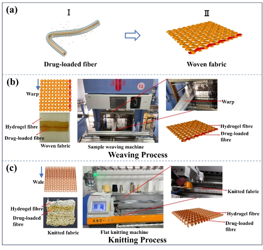 图4 (a)载药织物的制备;(b)载药机织物制备;(c)载药针织物制备