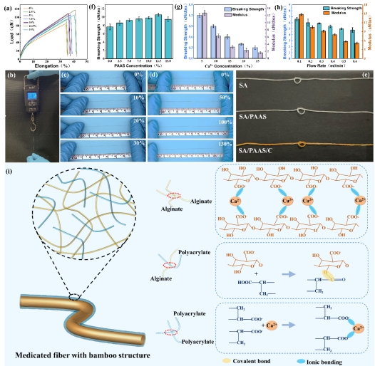 图2 SA、SA/PAAS、SA/PAAS/C纤维的力学性能及水凝胶纤维的成形机理 (a)不同PAAS含量纤维的载荷-伸长率曲线;(b) SA/PAAS纤维承载重物185克;(c) SA纤维拉伸表征;(d) SA/PAAS纤维拉伸表征;(e)纤维的良好柔韧性展示;(f)不同PAAS含量纤维的断裂强度;(g)钙离子浓度对纤维力学性能的影响;(h)不同内相流速下纤维的断裂强度和模量;(1)水凝胶纤维交联机理