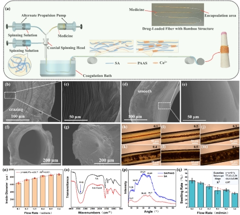 图1纤维的制备与表征 (a)竹状载药纤维的制备工艺;(b-g)纤维截面SEM图像;(h-m)不同内相流速率下纤维的光学显微镜图像;(n)不同内相流速率下的纤维内径;(o) SA纤维和SA/PAAS纤维的FTIR曲线;(p) SA纤维和SA/PAAS纤维的XRD曲线;(q)不同内相流速下纤维的溶胀性能