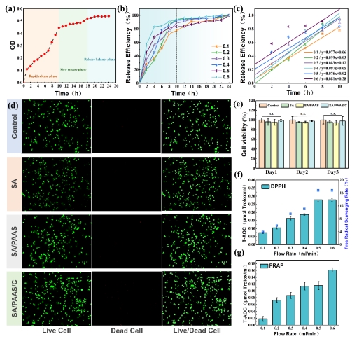 图3 载药纤维药物释放性能与生物相容性 (a)载药纤维缓释液在24h内不同时间段的吸光度;(b)不同内相流速下载药纤维的缓释结果;(c)前10h载药释放量线性拟合结果;(d)细胞活/死染色实验结果;(e) CCK8细胞存活率实验结果;(f)和(g)为不同内相流速下纤维的抗氧化活性