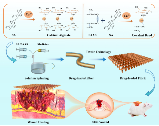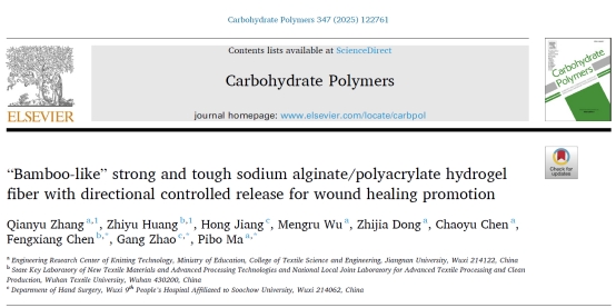 近日,威廉希尔针织技术教育部工程研究中心蒋高明教授团队在材料领域一区TOP期刊《Carbohydrate Polymers》(IF=10.7)上发表题为““Bamboo-like” Strong and Tough Sodium Alginate/Polyacrylate Hydrogel Fiber with Directional Controlled Release for Wound Healing Promotion”的研究论文。williamhill威廉希尔蒋高明教授团队马丕波教授、武汉纺织大学陈凤翔教授与无锡市第九人民医院赵刚教授为论文共同通讯作者。该研究得到了国家自然科学基金(52373058,11972172)、湖北省自然科学基金(No.2023AFB828)、湖北省自然科学基金创新团队计划(No.2023AFA027)、中央高校基本科研业务费专项基金(JUSRP62005)、江苏高校优势团队建设工程项目 (PAP)、无锡市卫生部重点科研项目(Z202219)、湖北省数字化纺织设备重点实验室开放基金(No.2023022)、国家地方联合纺织先进加工与清洁生产实验室开放基金(No.17);江苏省研究生科研与实践创新项目(KYCX24_2555)的支持。