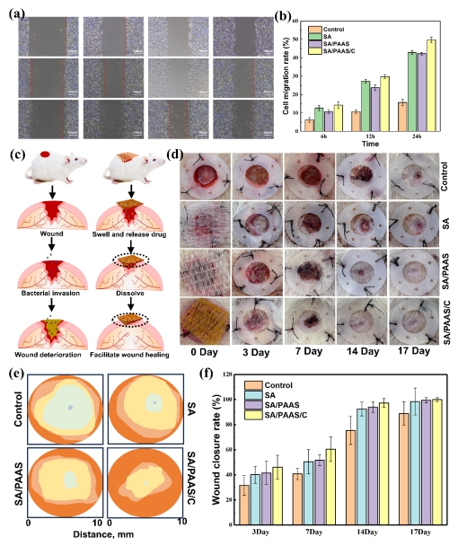 图5 体内细胞迁移结果及伤口愈合结果 (a)不同时间细胞迁移图像;(b)不同时间各组细胞迁移率;(c)水凝胶纤维织物促进伤口愈合示意图;(d)不同实验组在第0、3、7、14、17天伤口愈合的代表性照片;(e)不同实验组伤口愈合过程;(f) 不同实验组在第3、7、14、17 天的伤口愈合率
