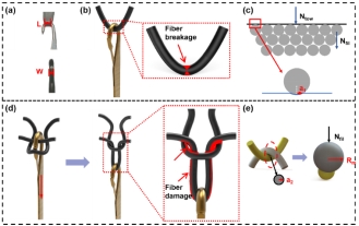 图5 碳纤维束弯纱过程应力分布,(b)碳纤维束成圈磨损形貌,(c)碳纤维束与碳纤维织物拉伸性能