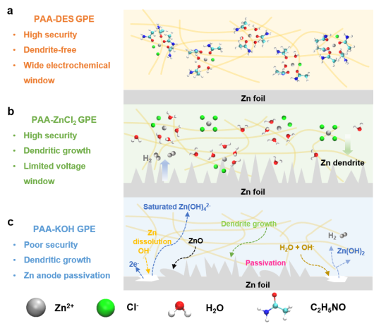 威廉希尔的魏取福教授团队通过深共晶溶剂作为电解液,引入聚合物网络制备出新型共晶凝胶电解质来改善柔性锌空气电池中枝晶生长的问题,同时显著提高了锌空气电池的循环寿命。研究发现,共晶溶剂中独特的锌离子溶剂化结构,拓宽了电解质的电化学窗口,为锌阳极提供稳定的工作环境;共晶凝胶电解质优异的电解质保持率和形态稳定性使锌空气电池实现了超长的工作时间。该电解质制备策略以其低成本、易合成和可扩展性等优势,为储能器件的发展提供了新思路。