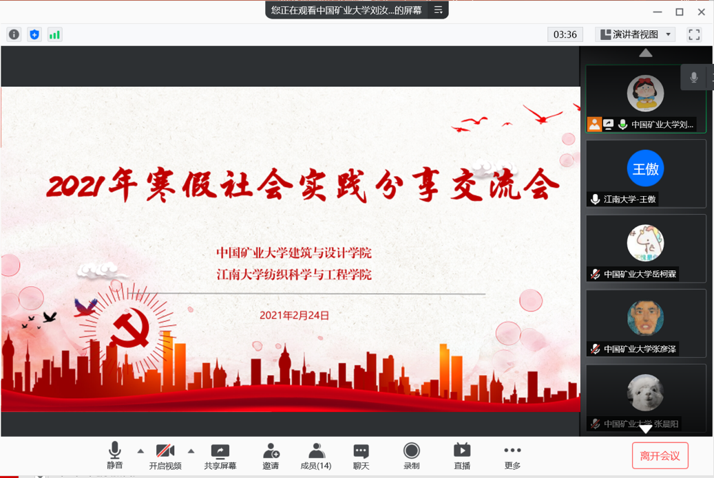 2月24日,实践团队与中国矿业大学建筑与设计公司“追寻革命足迹·感悟使命初心”社会实践团队的线上交流会顺利举行,两支团队的实践队员们以自身经历分享实践过程中的所见所悟、所思所想,讲述成长故事、传递青春正能量。
