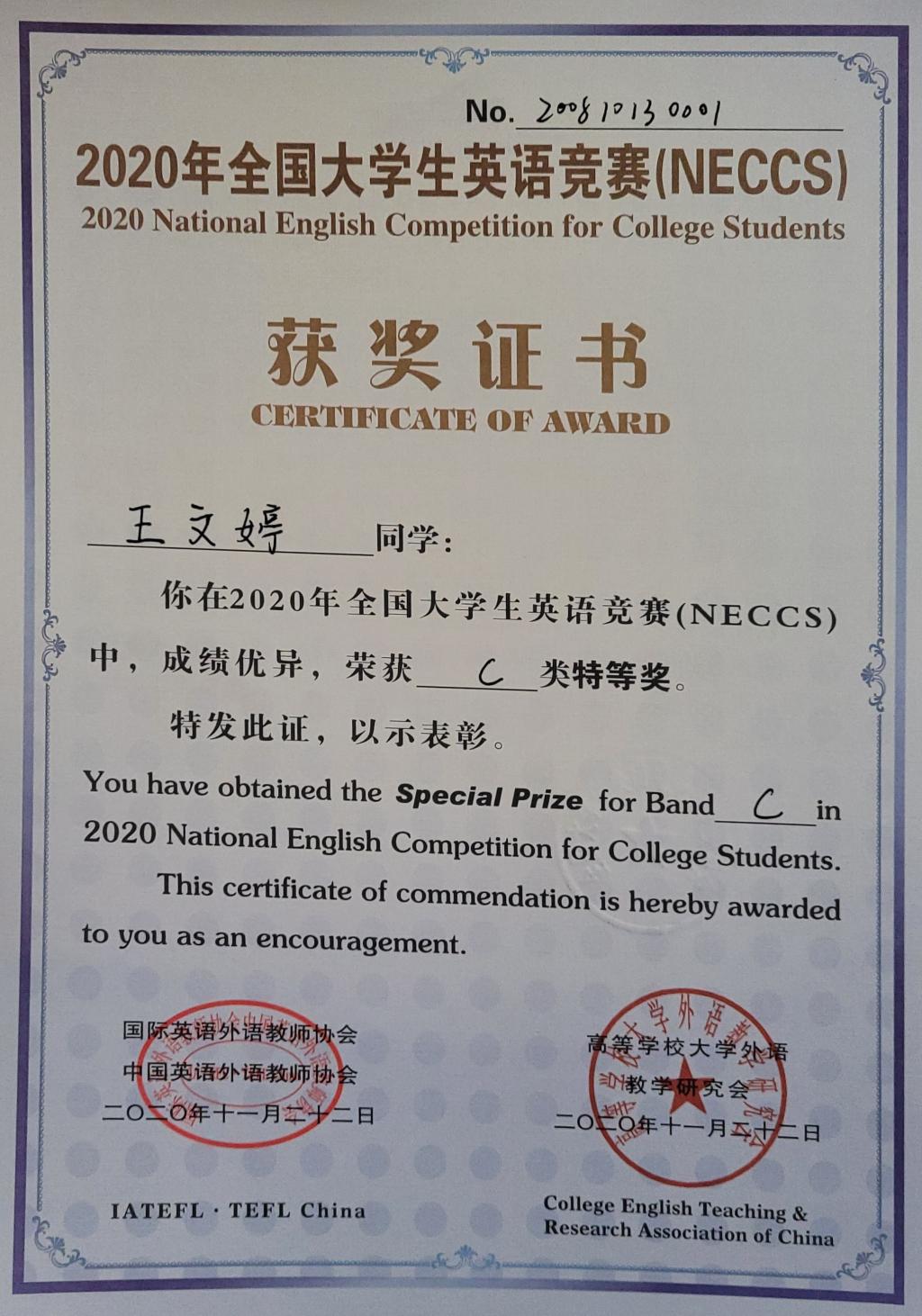 王文婷同学英语类获奖情况简介:
