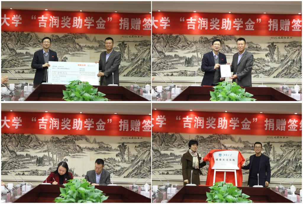 接着,在双方领导嘉宾的见证下,张菁书记与范恒明董事长签署了捐赠协议,张菁燕部长与范毅峰总经理为就业实习基地揭牌。张凌浩副董事长代表公司和公司接受了捐赠,并向吉润公司颁发捐赠赠书。