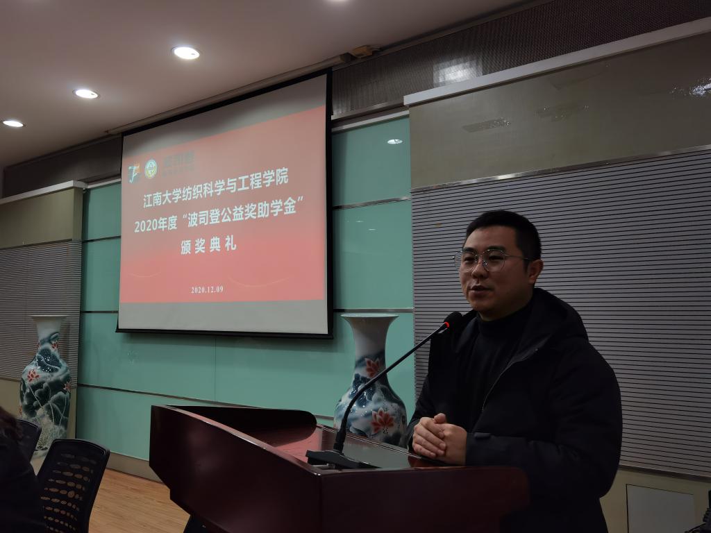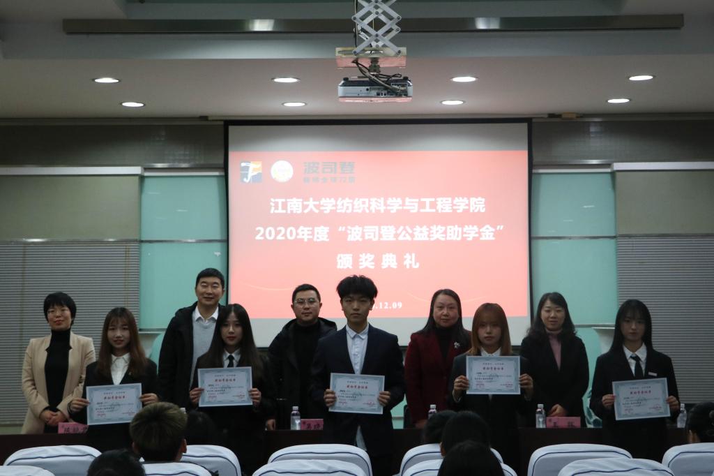 出席嘉宾为获奖员工颁发获奖证书并合影留念,受到奖励资助的82名同学依次上台接受颁奖。williamhill19纺硕专业员工王飞宇作为获奖员工代表发言,王飞宇同学在发言中,代表全体获奖员工向设立公益奖助学金的波司登集团及波司登公益基金会,以及关心和关注我们成长的公司领导和老师们表示衷心的感谢。他结合自己的求学历程,号召同学们要以波司登集团为榜样,尽我所能,达我所成,以优异的成绩回报社会回报企业,成为为国家建设和发展有用的人才,为社会做出贡献。