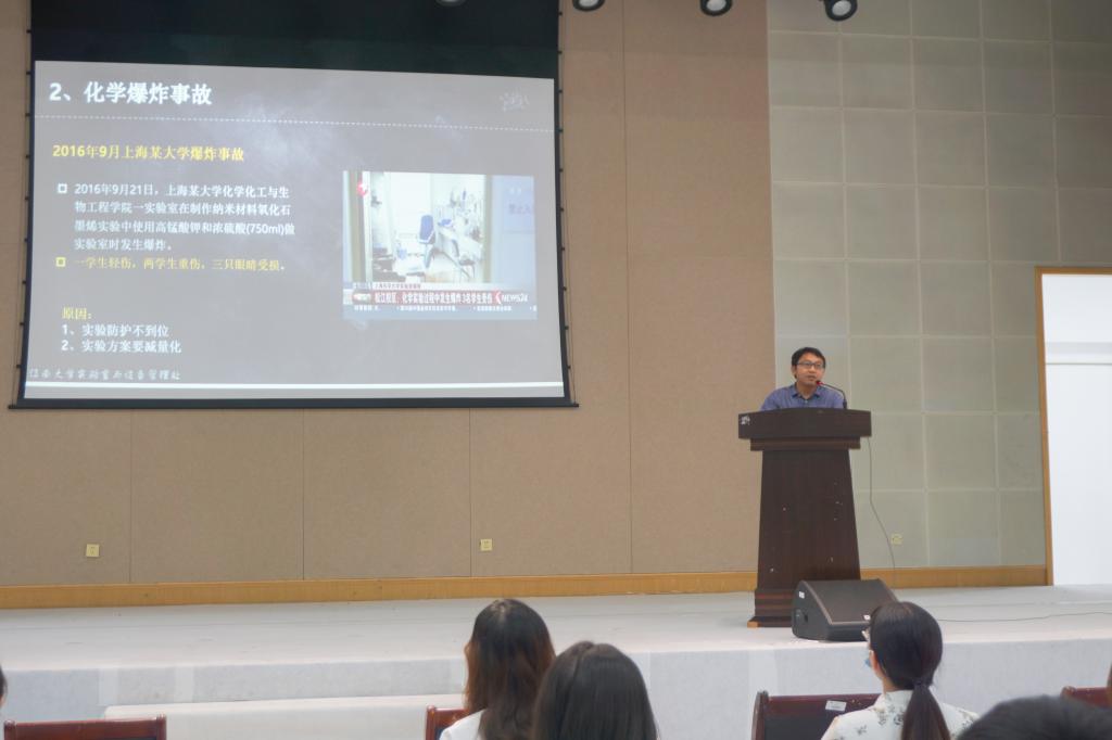 在开学典礼后,副经理刘庆生教授进行了实验室安全教育讲座,从实验室恰当着装、实验室安全设施、标准操作程序以及行为习惯等方面对于实验室安全规范操作进行讲解。他告诫研究生新生,初入实验室更应注意实验安全,做好防护措施,保持身体健康,才能安全实验,共同维护良好的科研、实验环境。