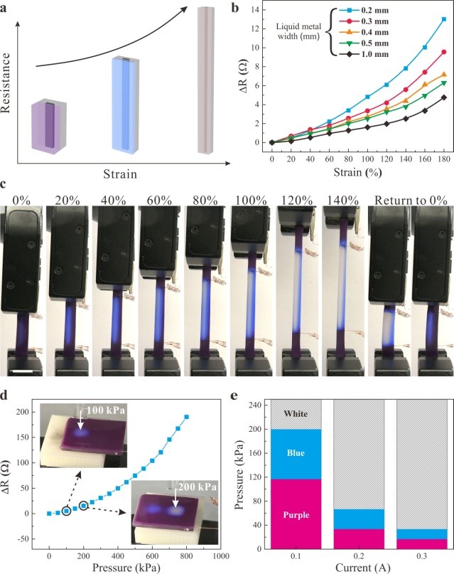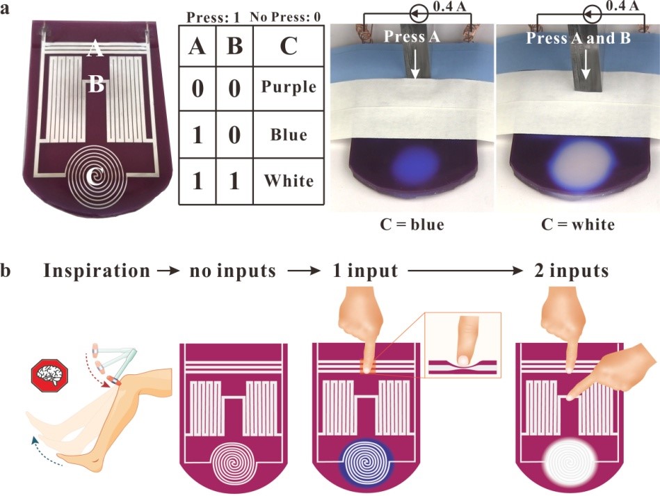 纺织服装公司葛明桥教授团队发现逻辑决策可以在材料层面完成,而不依赖半导体运算。受到章鱼手臂中分布式神经网络的启发,团队展示了一个完全柔软,可拉伸的有机硅复合材料(图1)。该有机硅复合体掺杂有热致变色颜料并可以受液态金属的支配,液态金属的变形能力使焦耳热发生几何变化加热,从而实现可调的热机械着色及感知触觉和应变(图2)。在更复杂的电路中,变形的液态金属可以重新分配电能到远端部分,以一种触觉“输入”转换成数字比色“输出”的方式来实现逻辑运算(图3)。