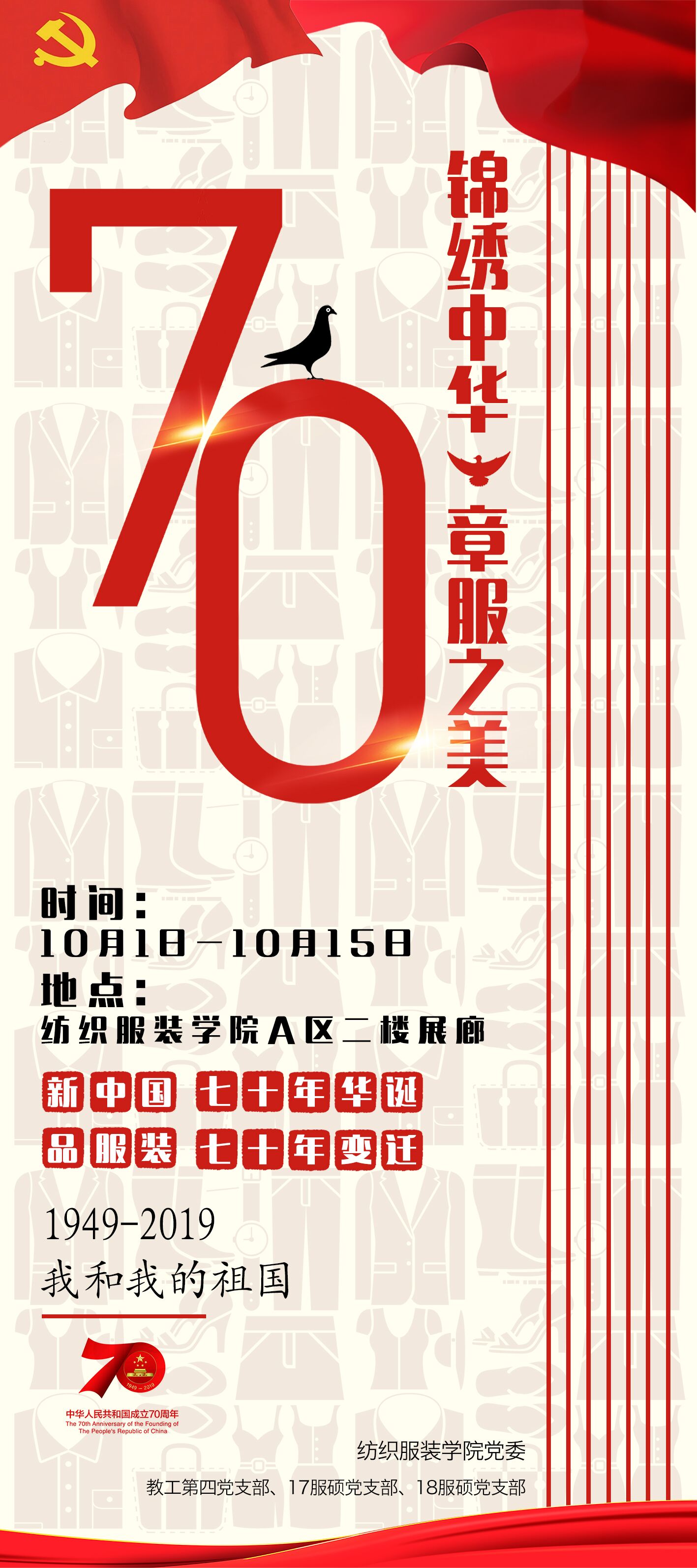 2019年9月30日,纺服公司师生党支部联合开展的“锦绣中华章服之美”——新中国成立70周年服装变迁史海报展在公司二楼展厅开展,展览预计为期半个月。