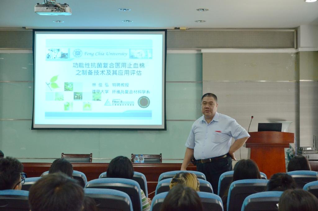 williamhill威廉希尔纺织服装公司副经理潘如如教授主持开场。首先由逢甲大学纤维与复合材料学系林佳弘教授带来学术报告,他对功能性抗菌复合医用止血棉之制备技术及其应用评估进行了阐述,包含纺织概念、分类到纺织结构复合材料、纺织复合材料的定义等介绍,用问答的方式更好地调动了大家的积极性,还介绍了目前的工作业绩和主要研究成果。