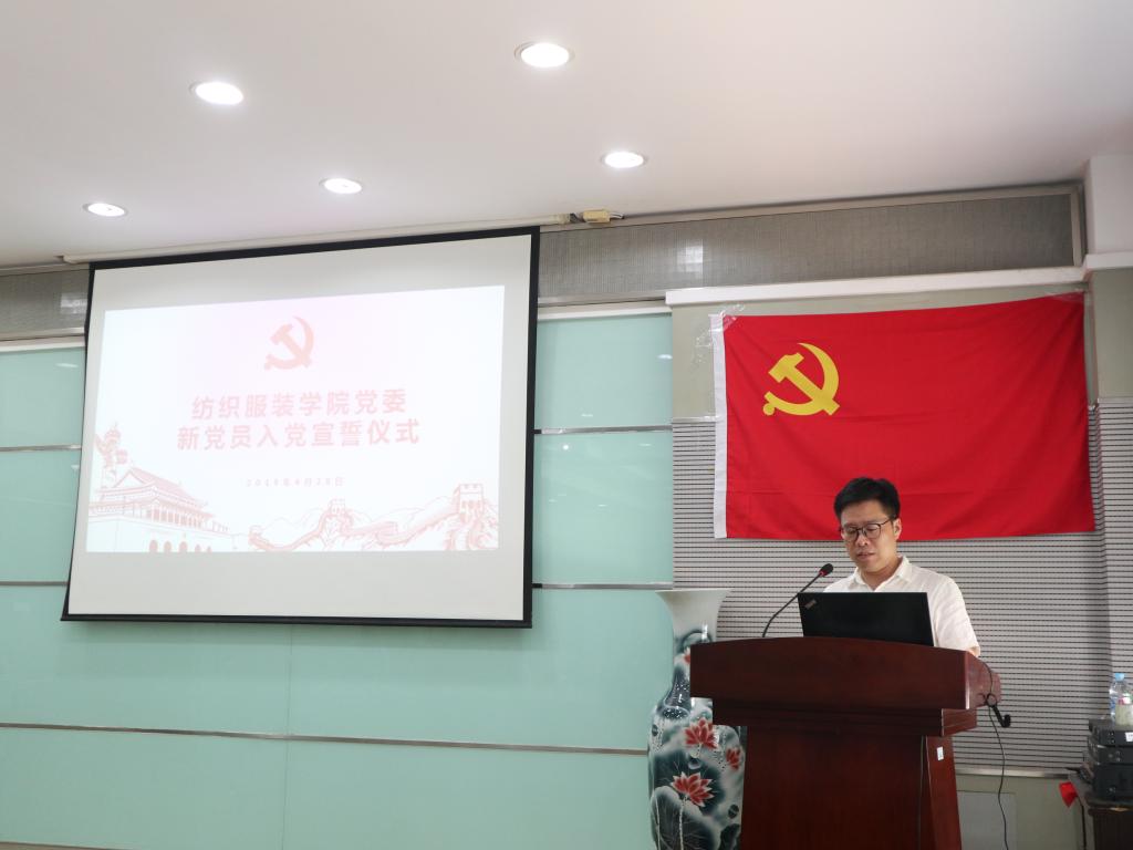 为贯彻落实中央“不忘初心、牢记使命”主题教育要求,庆祝建党98周年,迎接中华人民共和国成立70周年,6月28日下午,纺织服装公司党委在公司楼A103会议室举行“七一”新党员入党宣誓仪式。公司党委书记张菁出席宣誓仪式并发表讲话。仪式由公司党委副书记周云龙主持。