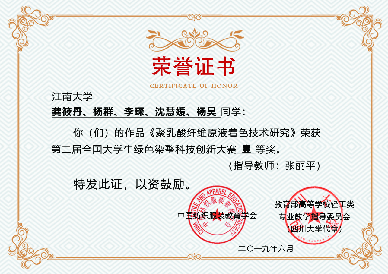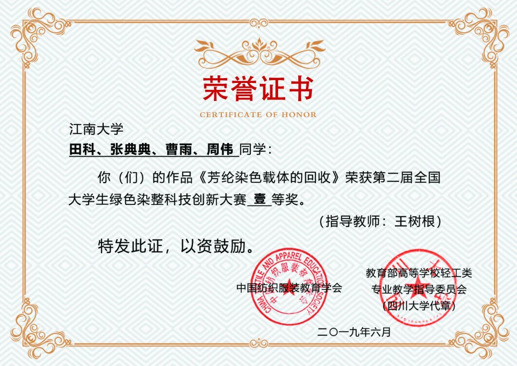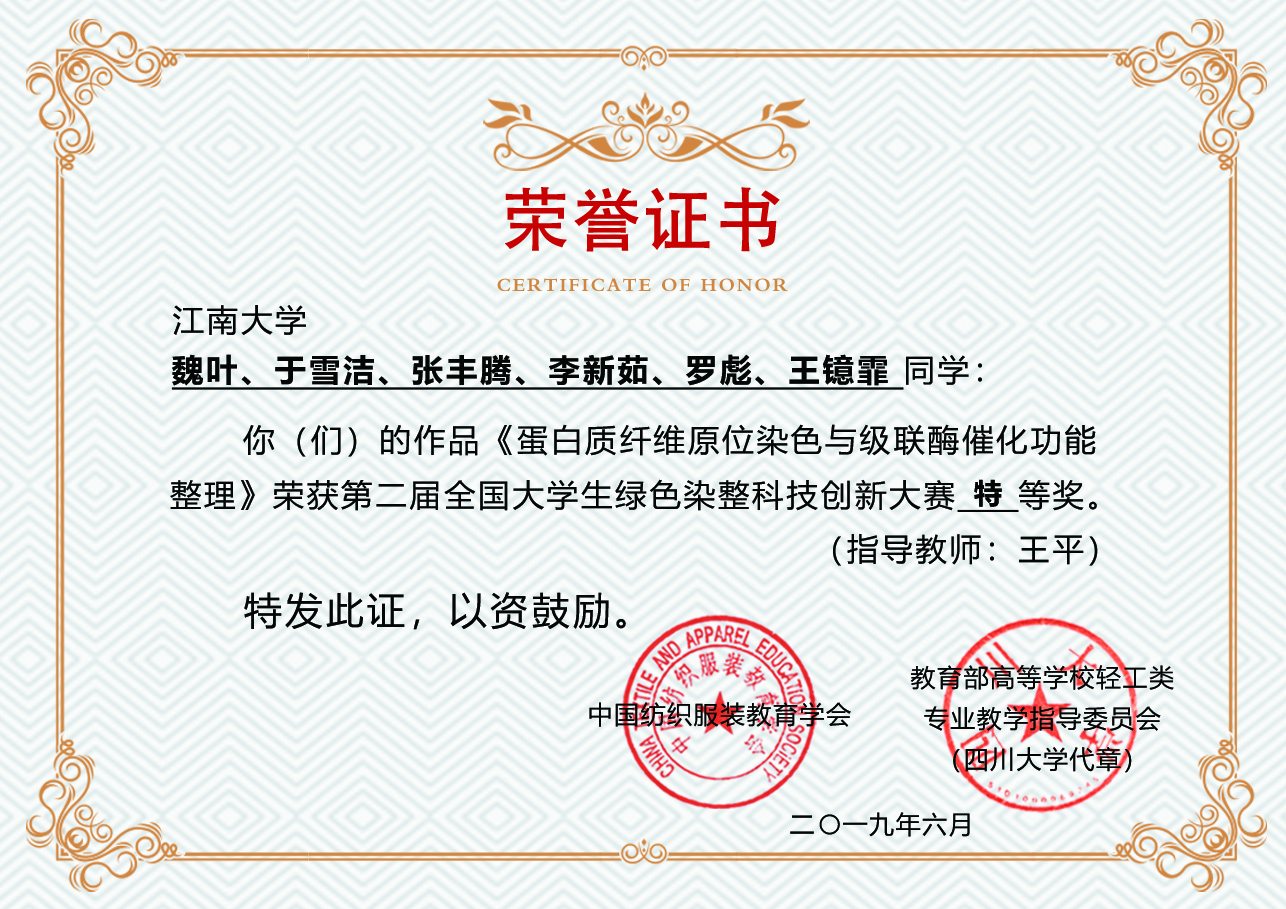 williamhill威廉希尔纺织服装公司共5项作品参评,由王平老师指导的项目《蛋白质纤维原位染色与级联酶催化功能整理》(员工负责人魏叶)荣获特等奖;由张丽平老师指导的项目《聚乳酸纤维原液着色技术研究》(员工负责人龚筱丹)和由王树根老师指导的项目《芳纶染色载体的回收》(员工负责人田科)荣获一等奖;由任学宏、刘颖老师指导的项目《一种抗菌/油水分离纳晶纤维素气凝胶的制备与应用》(员工负责人张艳)荣获二等奖;由袁久刚老师指导的项目《基于DES体系的羊毛低温染色及防缩加工技术》(员工负责人张依依)荣获三等奖。