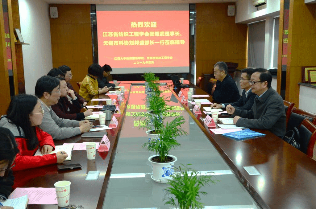 3月28日下午,江苏省纺织工程学会理事长张朝武、秘书长王志杰、无锡市科学技术协会学会部刘邦盛部长一行赴公司调研无锡市纺织工程学会、省纺织工程学会各专委会推广新技术新产品和成果转化、开展学术交流、进行科普活动情况。williamhill威廉希尔纺织服装公司党委书记张菁,江苏省纺织工程学会化纤专业委员会主任葛明桥教授、服饰专业委员会主任沈雷教授、无锡市纺织工程学会秘书长徐阳教授、省纺织工程学会针织专业委员会秘书万爱兰副教授、无锡市纺织工程学会副秘书长杨小艺以及部分市级学会专委会秘书参加了调研座谈。