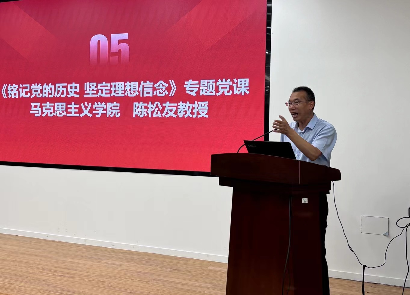 马克思主义公司陈松友教授讲授《铭记党的历史 坚定理想信念》专题党课。他围绕建党百年的“四个伟大成就”深情回顾了中国共产党百年党史的峥嵘岁月。这“四个伟大成就”一脉相承,是中国共产党百年来始终以“实现中华民族伟大复兴”为主题的辉煌成果,书写了中华民族历史上的恢宏史诗。陈教授勉励党员同志要坚定理想信念,牢记初心使命,继承和发扬党的光荣传统,以老一代革命家为榜样,勇于做走在时代前列的奋进者、开拓者、奉献者。