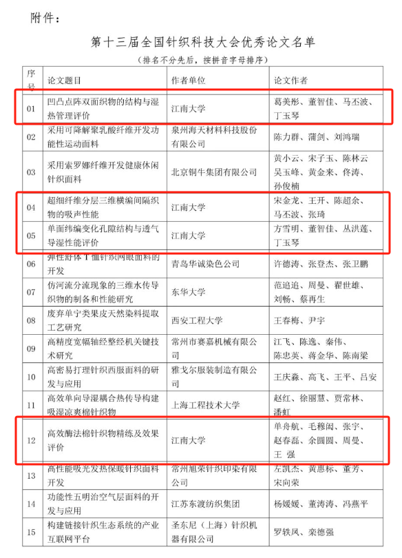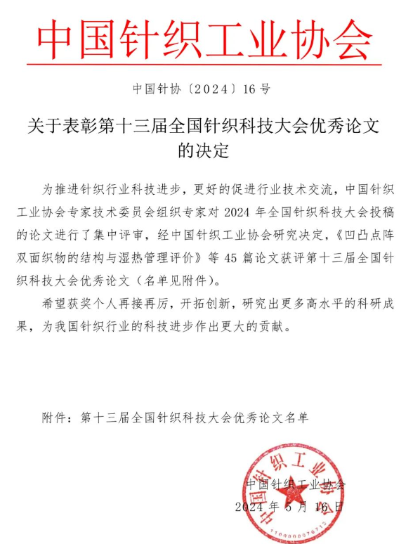 大会还进行了第十三届全国针织科技大会优秀论文颁奖,公司《凹凸点阵双面织物的结构与湿热管理评价》《超细纤维分层三维横编间隔织物的吸声性能》等8篇论文获评第十三届全国针织科技大会优秀论文(共评选出45篇),中国针织工业协会专家技术委员会主任瞿静、常务副主任杨启东为获奖者颁发了证书。