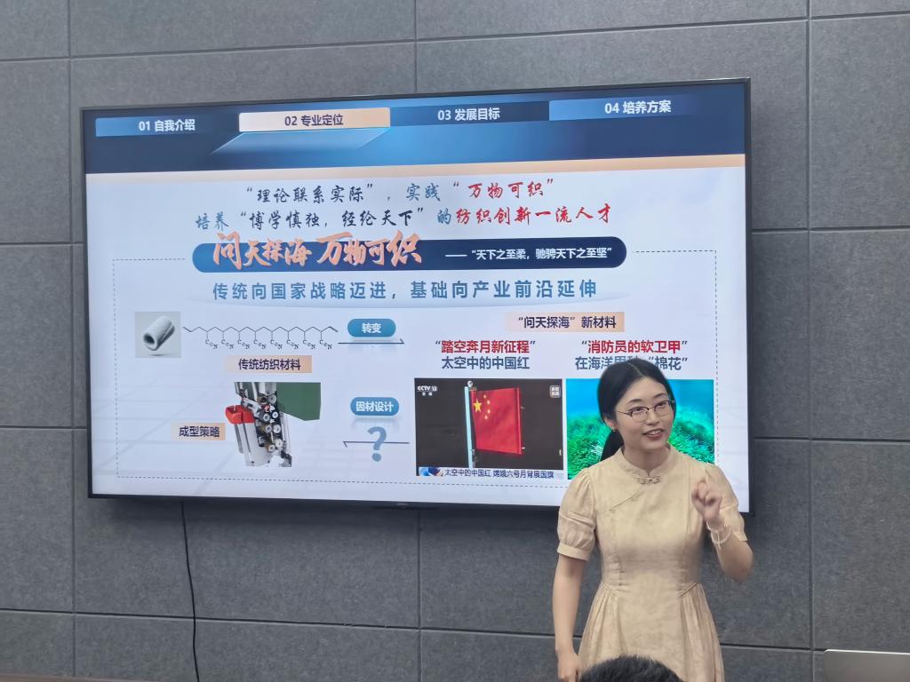 李蔚就专业定位和培养方案向参会师生进行了汇报,并分享了往届优秀员工代表的学习经验和案例,鼓励员工将个人兴趣与国家战略需求、科技进步前沿相结合,成为推动纺织“问天探海、万物可织”新质生产力。