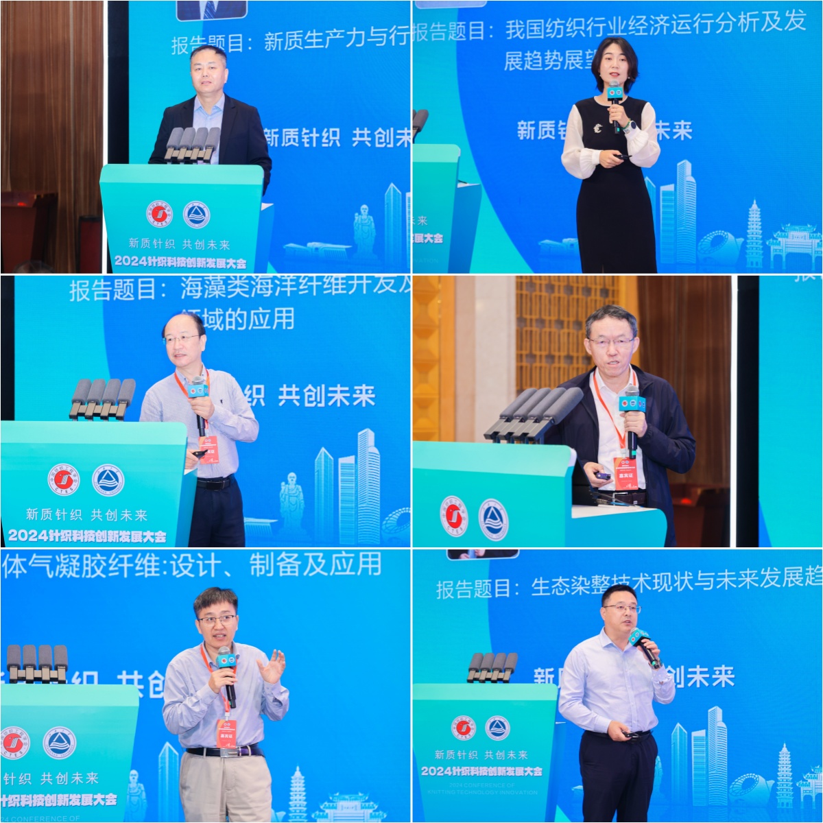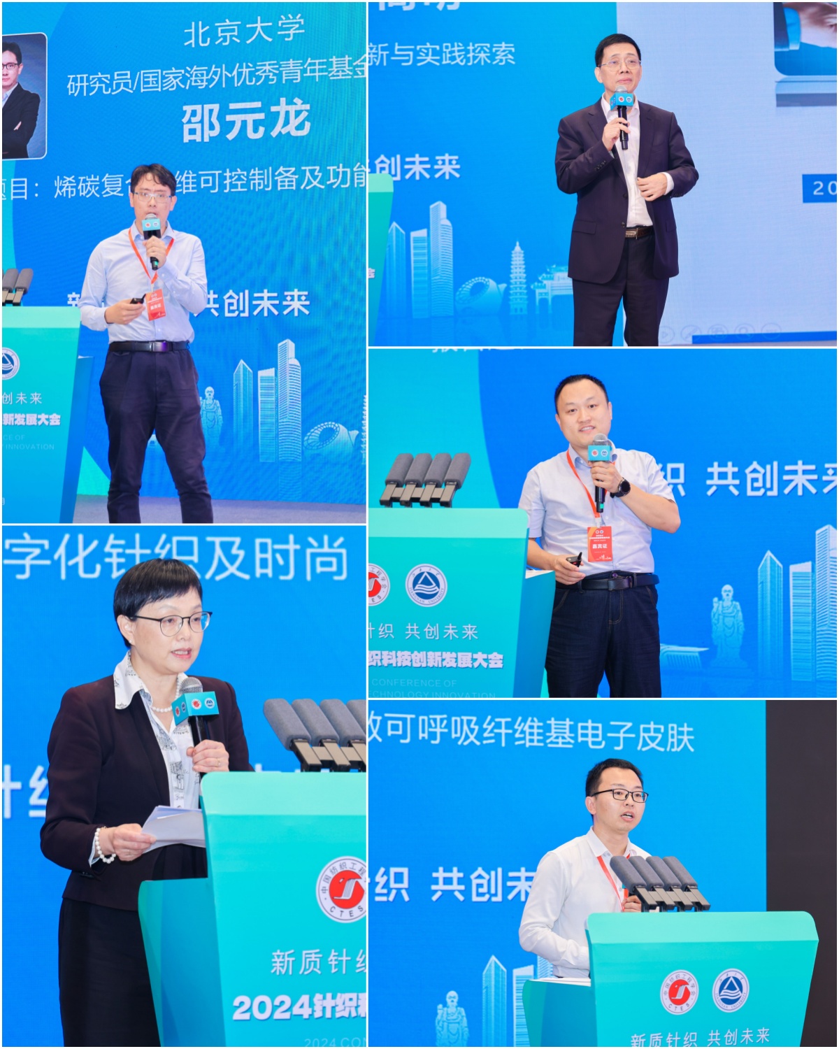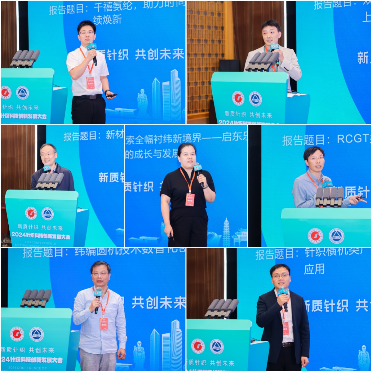 在报告交流环节,中国纺织工程学会理事长伏广伟,中国纺联产业部处长张倩,青岛大学教授、国家自然科学基金杰出青年基金获得者夏延致,武汉纺织大学教授、俄罗斯自然科公司院士梅顺齐,中科院苏州纳米所教授、科技领军人才张学同,威廉希尔经理、科技领军人才付少海,北京大学研究员、国家海外优秀青年基金获得者邵元龙,美国路易斯安那州立大学教授刘传兰,williamhill威廉希尔教授、中国纺织工程学会针织专业委员会主任蒋高明,东华大学教授、青年拔尖人才李召岭等分别以《新质生产力与高质量发展的几点思考》《我国纺织行业经济运行分析及发展趋势展望》《海藻类海洋纤维开发及在针织领域的应用》《新质生产力引领纺织智能制造高质量发展的体会》《胶体气凝胶纤维:设计、制备及应用》《纺织品生态染整技术研究现状与发展趋势》《烯碳增强纤维可控制备及功能化应用》《Machine Knitting for Fashion –A Focus on 3D/Whole Garment Knitting》《针织技术创新与实践探索》《高灵敏可呼吸纤维基电子皮肤》为题作行业发展思考报告和前沿领域研究分享。华峰化学股份有限公司,福建佶龙机械科技股份有限公司,安徽吴方机电科技有限公司,启东乐欣纺织科技有限公司,无锡市兴盛新材料科技有限公司,圣东尼针织机器有限公司,江苏金龙科技股份有限公司代表分别以《千禧氨纶,助力时尚产业可持续焕新》《双针床贾卡经编机在鞋面及服装上的应用和趋势》《新材料在织针上的应用及发展》《探索全幅衬纬新境界——启东乐欣的成长与发展》《RCGT柔软超高弹纤维》《纬编圆机技术数智化创新及其产品》《针织横机类产品发展趋势及创新应用》等为题,分享了公司的创新产品及应用案例。