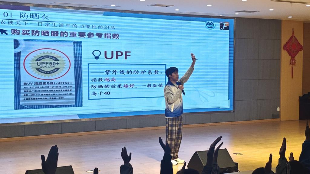 活动现场,主讲人王生域以其幽默风趣、深入浅出的讲解方式,引领员工深入了解纺织品在日常生活与专业领域的广泛应用。。从防晒衣、速干衣等日常用品,到飞机、深海探索器“蛟龙号”,再到宇航服等高科技产品……王生域逐一揭示这些高科技纺织品背后的“织”造奥秘,生动展现了纺织科技如何助力人民福祉与国家发展,点燃员工们心中的纺织强国之梦。