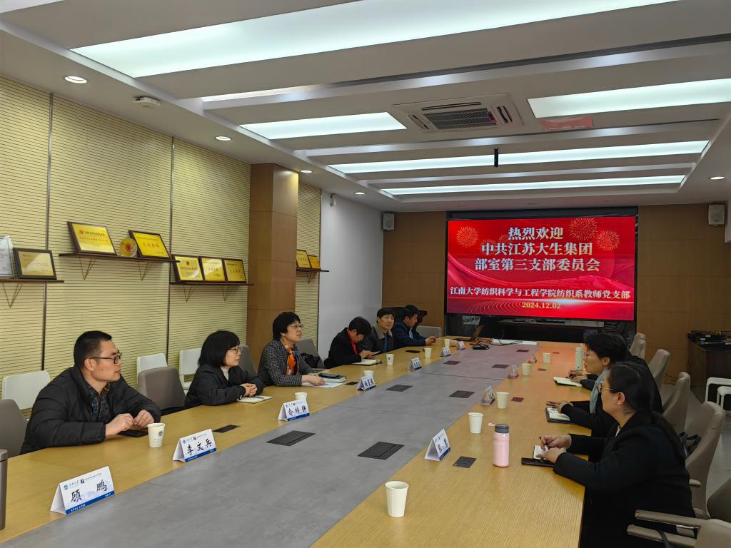 为了积极推动校企党组织共建、产学研对接、科技创新等方面的合作,12月2日,江苏大生集团部室第三党支部书记、创新管理中心主任、生产技术部副部长李兰女率队来院交流考察。公司党委书记张菁燕,纺织系教师党支部书记俞科静及支部相关教授参加了座谈交流。