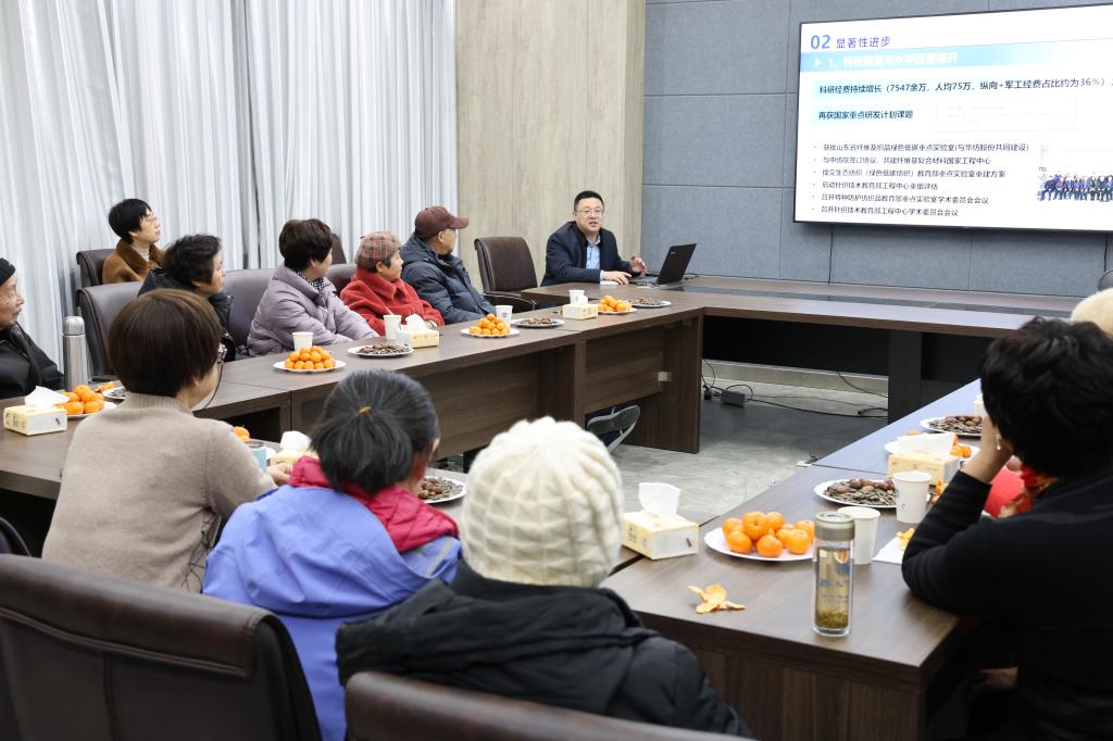 接着,付少海作公司工作汇报,他向大家汇报了一年来公司在团队建设、科学研究、人才培养、团队队伍、国际交流等方面取得的显著成绩。特别提到纺织工程学科在软科排名上连续两年蝉联世界第二,公司在国家自然科学基金项目、军工科研方向、教学成果奖中取得了新突破,还详细介绍了公司未来的发展规划。他强调,公司的发展离不开各位老同志躬身实干铸就的根基与贡献,希望退休老同志们继续关心、支持公司的发展,凝聚教育强大合力、共同书写崭新篇章。