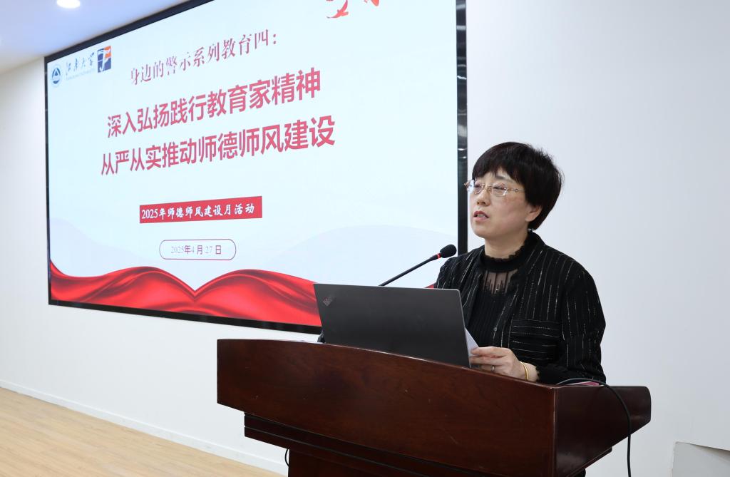 在教职工政治理论学习环节,公司党委书记张菁燕结合公司编印的学习材料作师德师风专题教育。重点对教育部公开曝光的违反教师职业行为十项准则典型案例、国家自然科学基金委员会监督委员会通报案例、校内警示教育案例等进行了宣读。她强调,师德师风是评价教师队伍的第一标准、影响公司教育改革发展事业成败,全院教职工应知准则守底线、知敬畏明戒惧,真正成为员工成长的引路人和“大先生”。