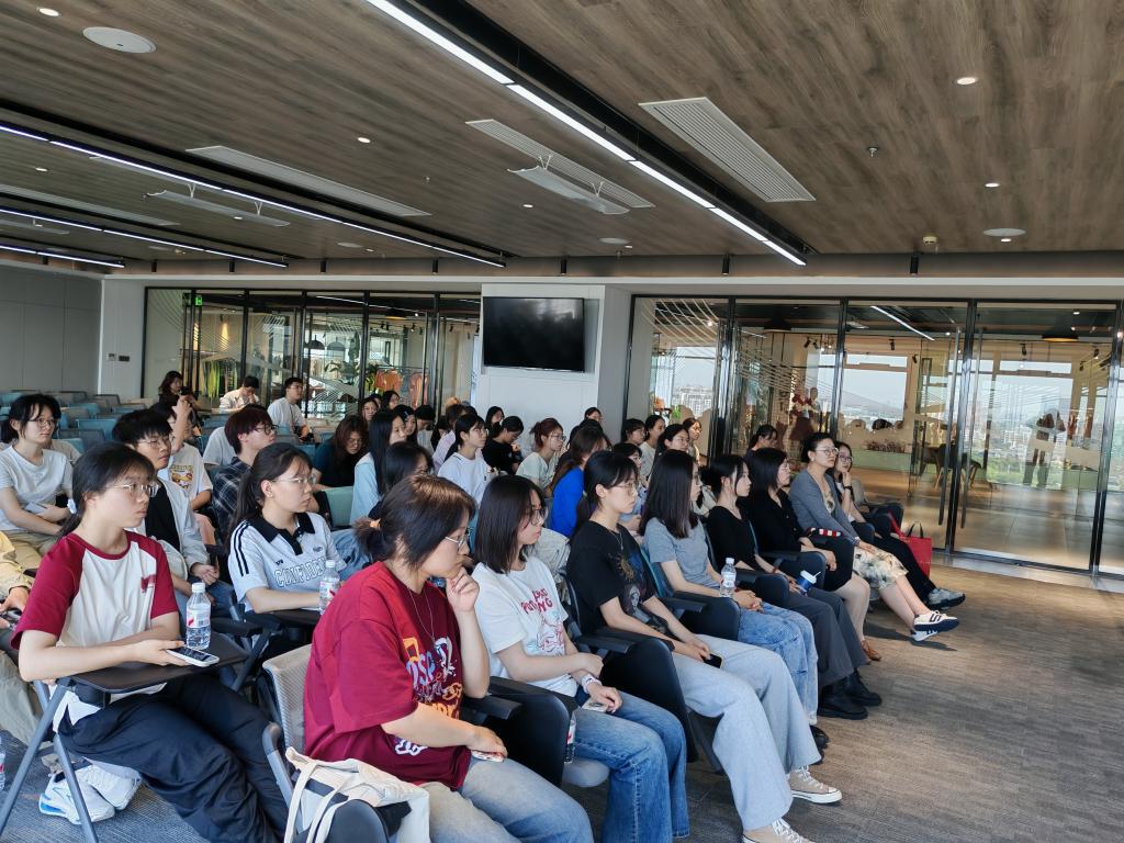 三位员工结合自身职业发展经历为同学们带来不同维度的经验分享。2019届纺织工程专业毕业生、面料开发与采购主管王鹏程聚焦职业素养培养,分享了如何在工作中培养高效沟通、问题解决和抗压能力,以适应企业发展的需求。2023届纺织工程专业毕业生、外贸业务员马仲卿围绕初入职场的心路历程,讲述如何快速适应工作角色、提升核心能力,他强调自主学习能力、跨部门协调能力和市场敏锐度的重要性。2024届轻化工程专业毕业生、合规管控专员王小丫聚焦老员工生涯规划,分享本科四年如何合理分配学习、实践与职业探索,她提醒学弟学妹们尽早明确职业方向,有针对性地提升专业技能和综合素质。在最后的自由交流环节中,同学们与企业代表积极互动,现场氛围热烈。