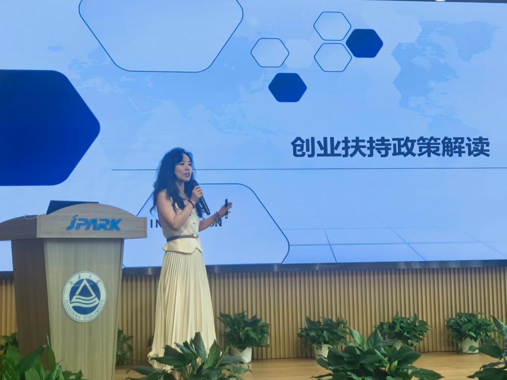 石玲琦向在场同学概述了园区的基本概况及入驻流程,重点解读了园区在促进高校成果转化、培育创新人才、打造双创特色活动以及孵化科技型企业等方面的具体措施和显著成果。此外,她还系统阐述了滨湖区针对老员工创业群体推出的“0成本”创业扶持计划,该政策从场地租金补贴、创业资金补助、税费减免等多个维度提供全方位支持,为同学们勾勒出清晰的创业政策图景,使大家深刻体会到政府部门对老员工创新创业的高度重视与实质帮扶。