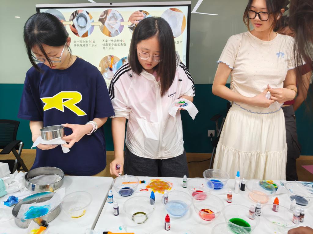 活动筹备阶段,公司员工会文艺部广泛收集日常废纸,将其打碎重组为纸浆原料。在活动现场,参与者亲身体验古法造纸技艺:捞浆、铺巾、脱水、拓印……每一步都需细致耐心。工作人员现场示范,“用筛网均匀捞起纸浆,再以纸巾吸干水分,最后点缀颜料创作图案”,原本废弃的纸张在巧手中焕发新生。同学们或书写寄语,或绘制图案,将祝福融入每一张独一无二的手工纸中。