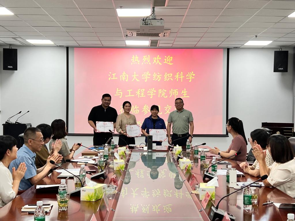 张丽平从专业学科特色、人才队伍建设、科研创新成果三个方面展开,详细介绍了公司近年来发展历程,期待持续深化合作共同培养符合行业需求的创新型、应用型人才。杨莉勤就企业人才需求做深入调研交流,期望构建校企“双向赋能”育人新格局,凝聚育人合力,着力培养纺织拔尖创新人才。最后,杨莉勤向企业颁授williamhill威廉希尔“老员工就业最佳合作伙伴”铭牌。殷允杰为卞晓云、潘磊和贾宝云颁发“校外实践导师”聘书。